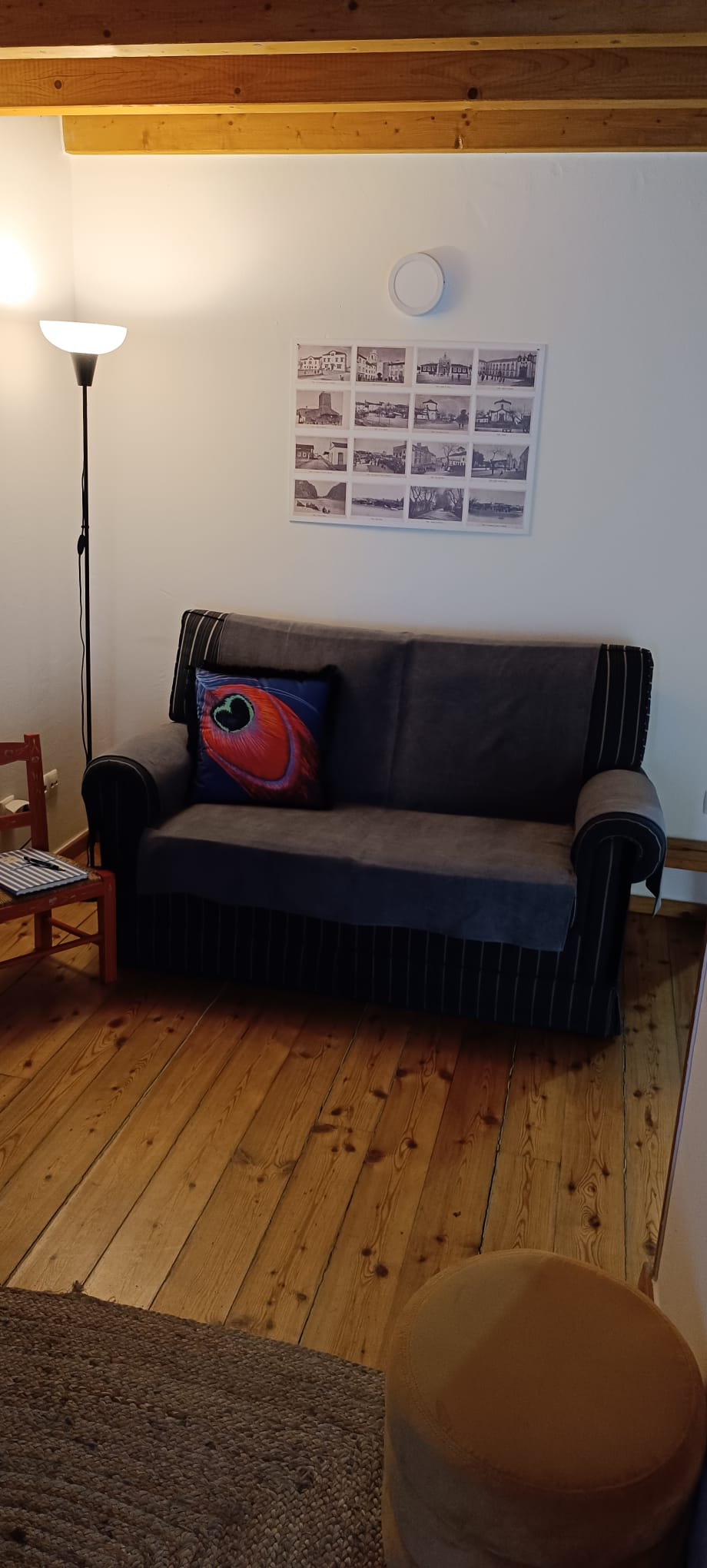 A sala tem um sofá de dois lugares que faz cama para uma pessoa;