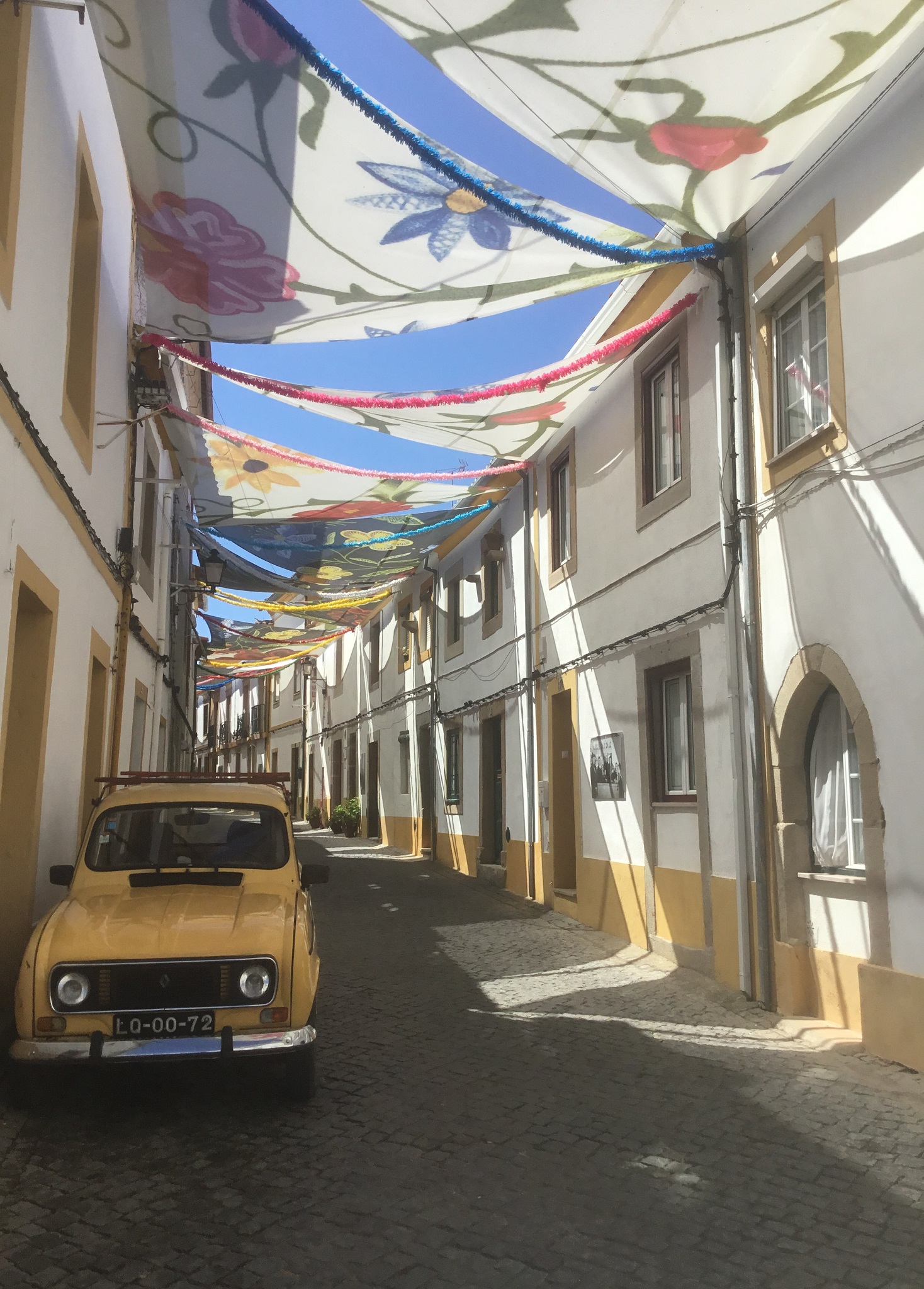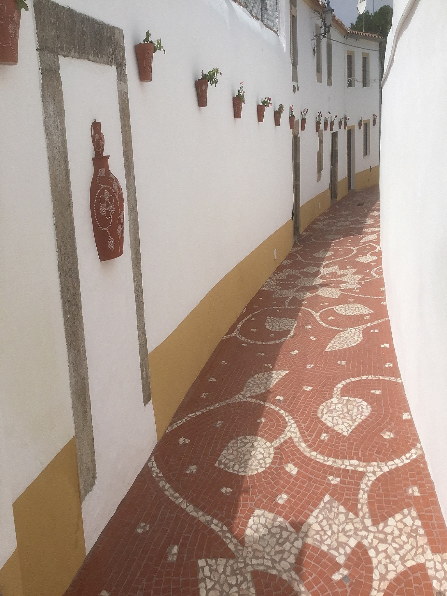 Uma charmosa e estreita rua pedonal que foi calcetada e ornamentada em homenagem à olaria pedrada de Nisa.